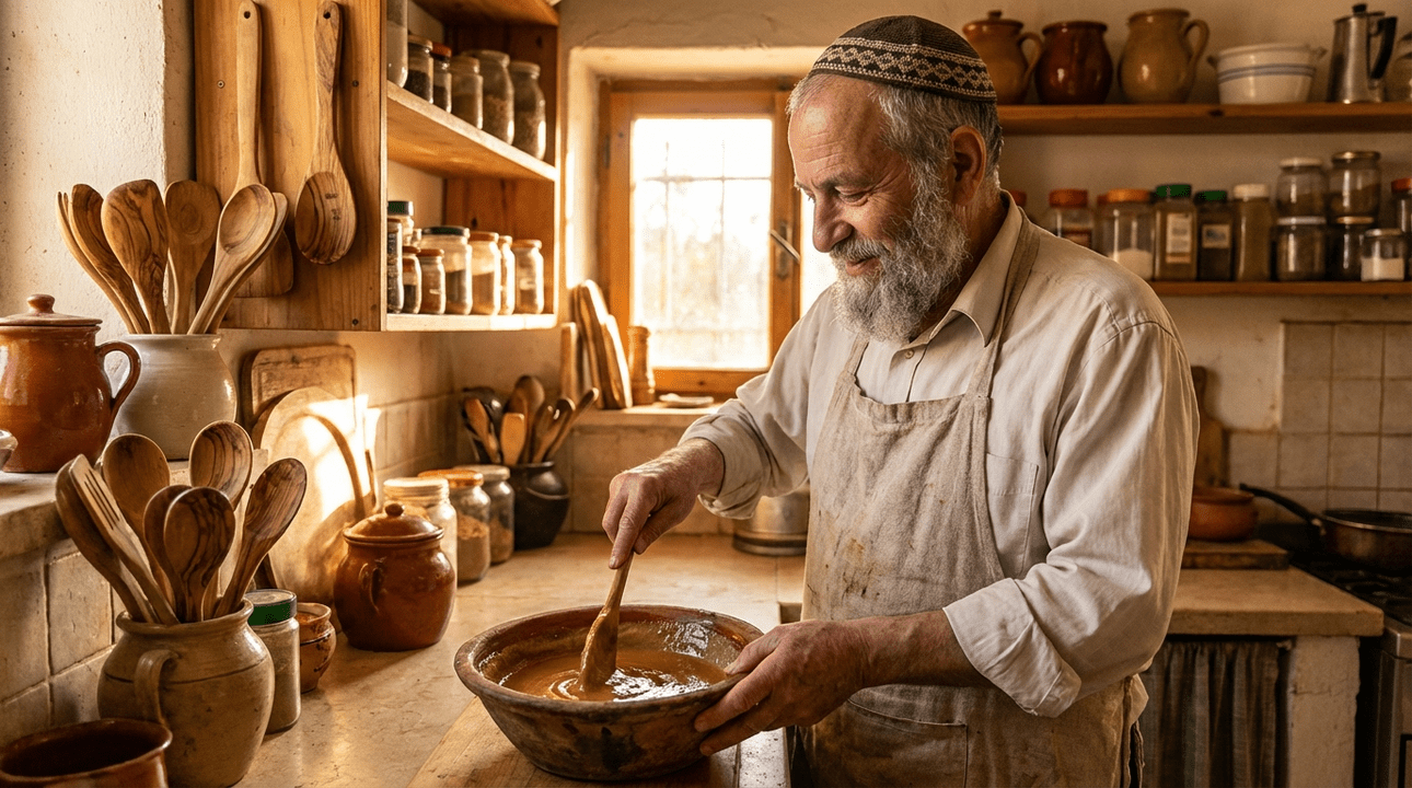 Elderly Jewish man making tahini with honey in rustic kitchen.