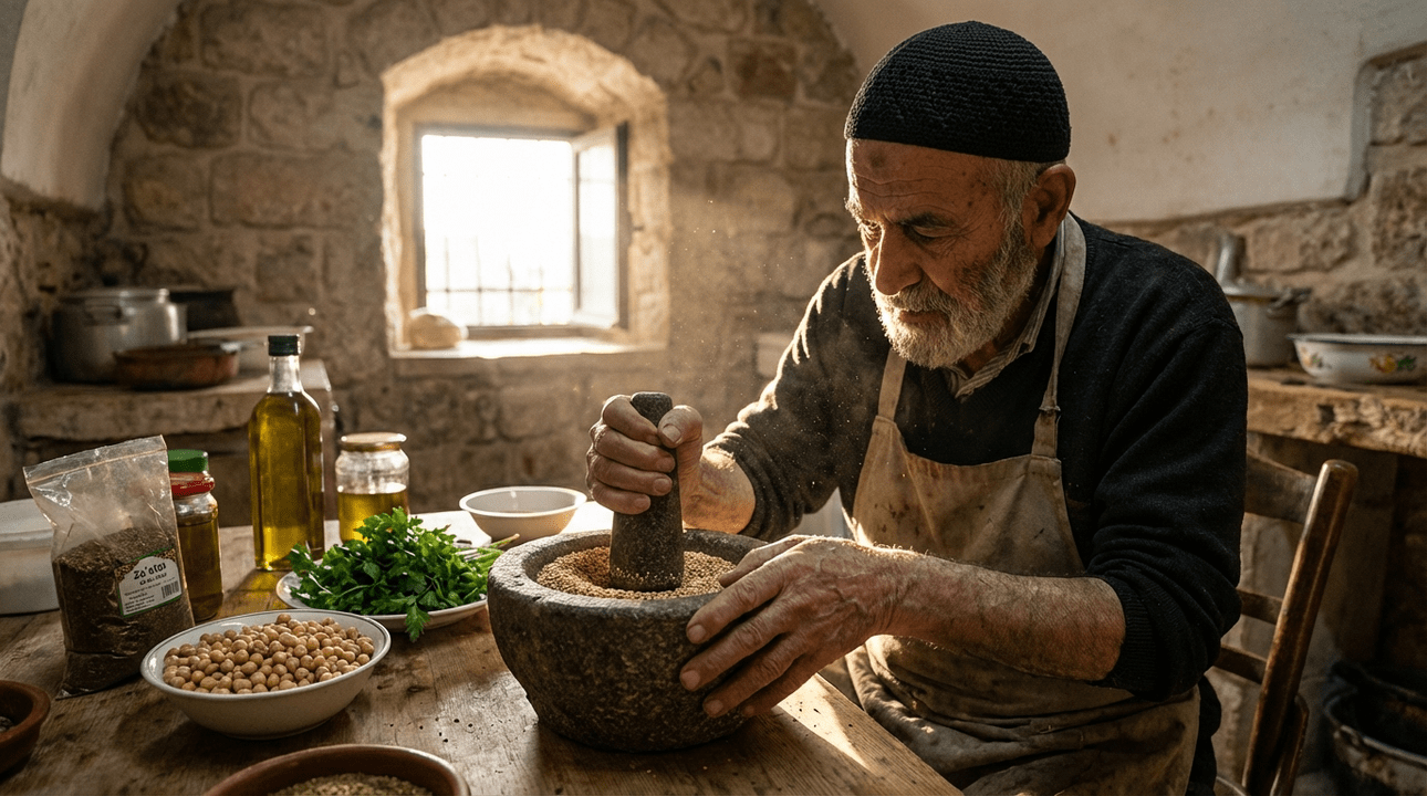 Elderly Israeli chef grinds sesame seeds in a rustic kitchen.