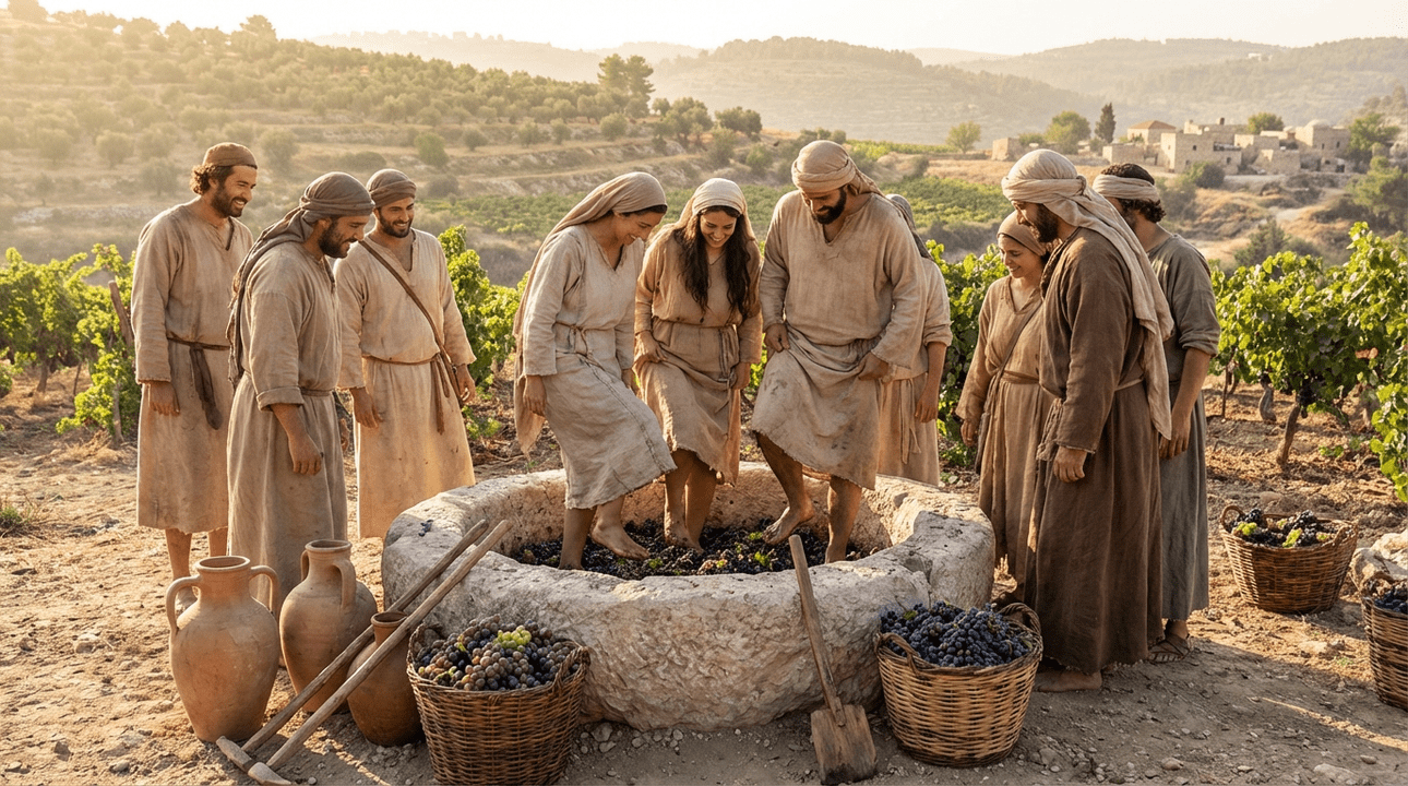 Biblical winemaking was a straightforward process, producing a natural beverage distinct from today’s refined wines. Grapes were harvested and crushed in stone vats, as described in Isaiah 16:10, where the joy of the harvest is celebrated.