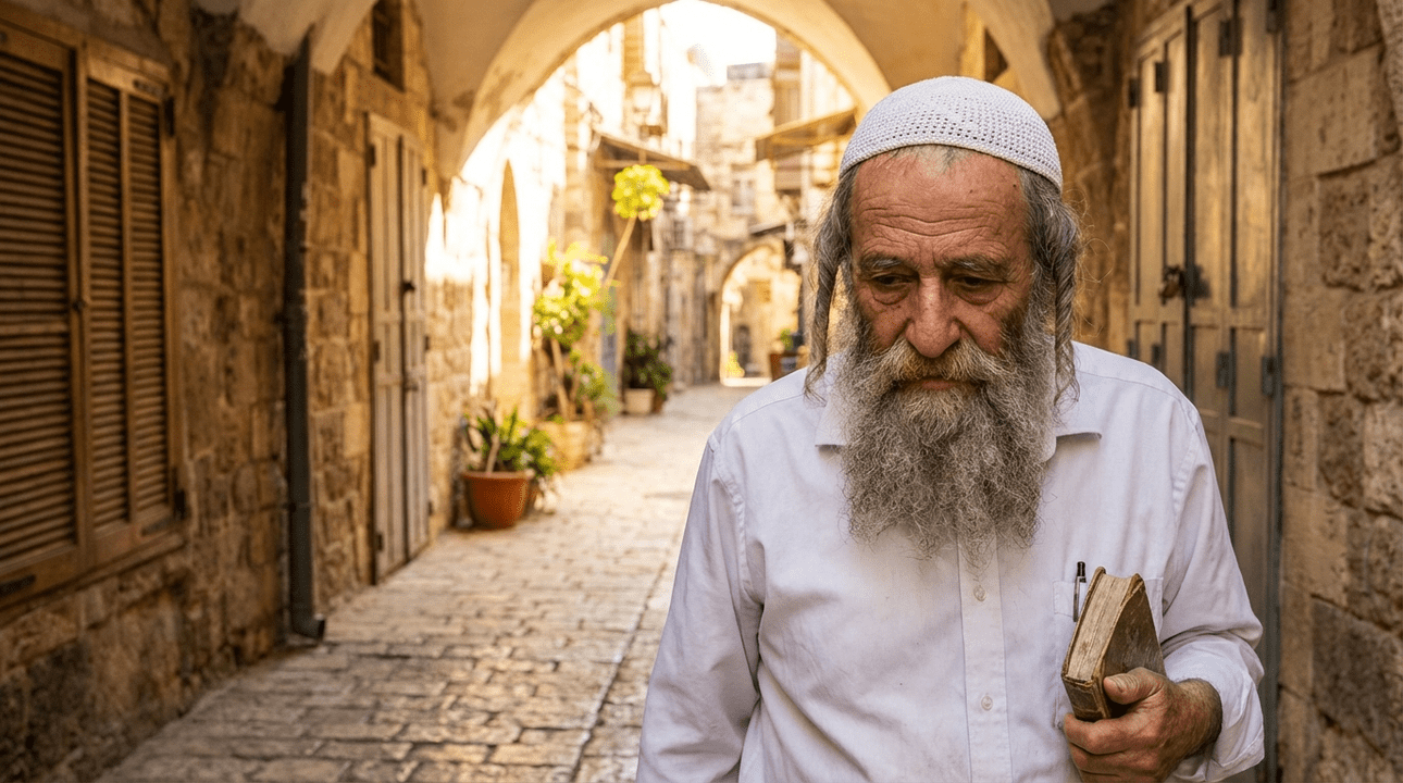 Elderly Jewish man in kippah, standing in sunlit Jerusalem alley.
