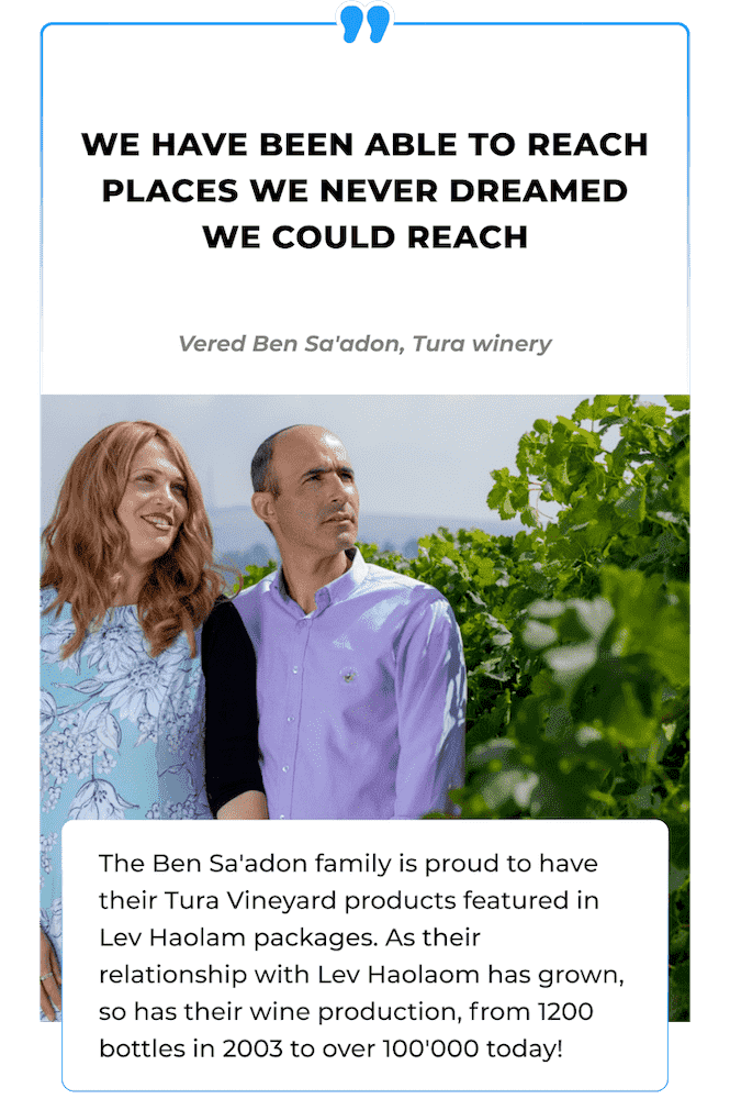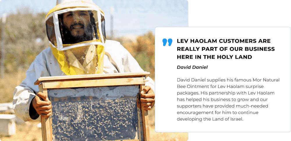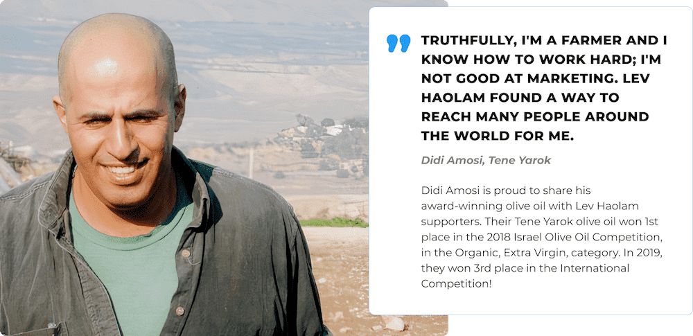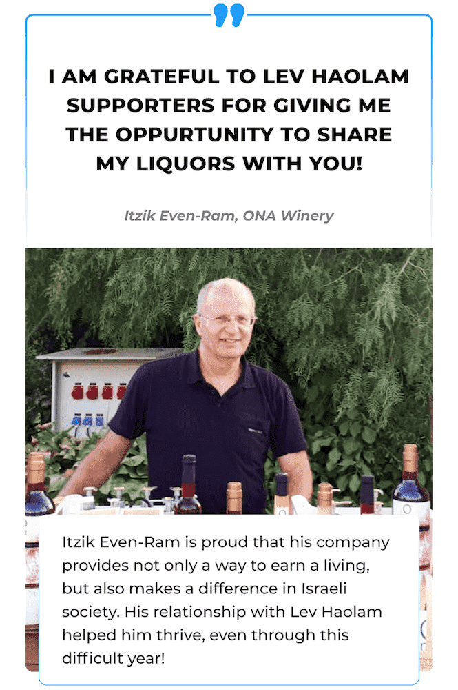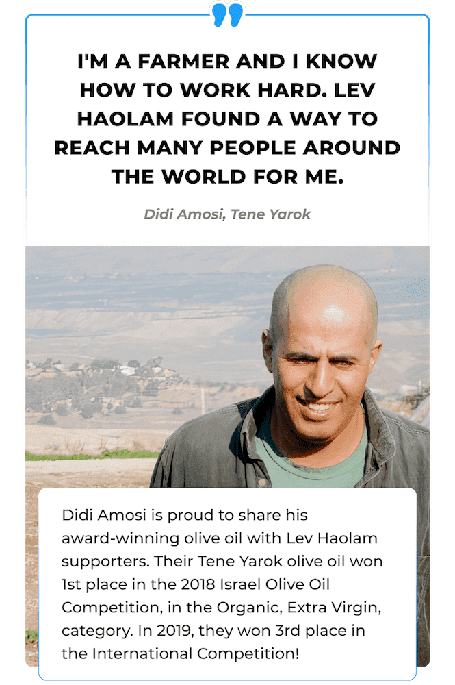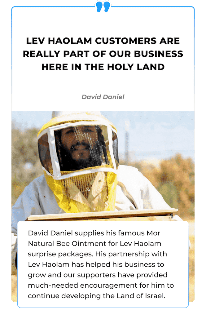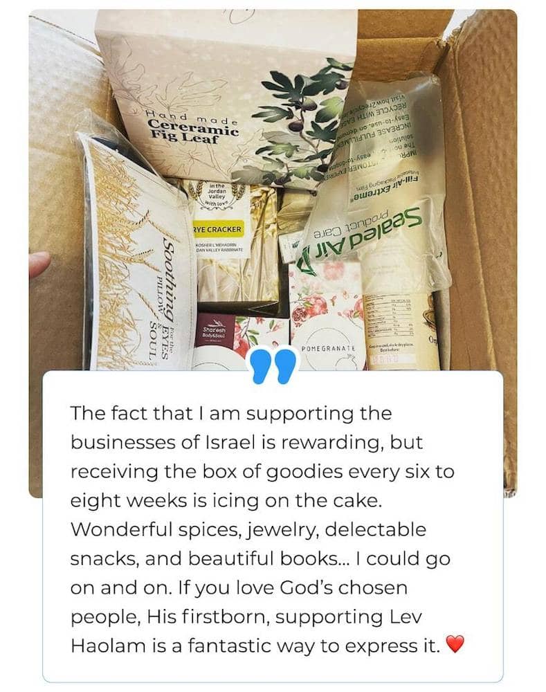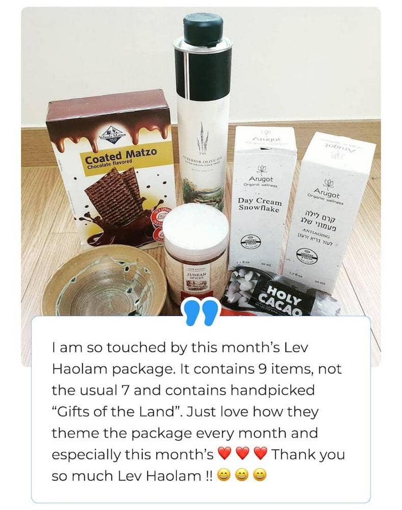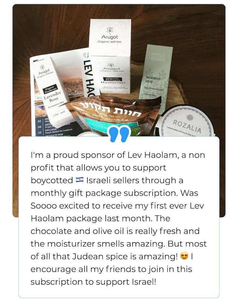 LEV HAOLAM is an organization that supports local Jewish business owners in Judea and Samaria who are suffering because of the anti-Israel Boycott, Divestment and Sanctions (BDS) movement. Lev Haolam gives pro-Israel individuals the opportunity to support these Jewish pioneers and their families through our Surprise Monthly Package Project. Members who sign up to our Website and become members of Lev Haolam shall receive monthly packages filled with products (inside each monthly package, our subscribers receive approximately 7 to 8 unique items that are produced by companies specially within the Judean, Samarian, and Golan Heights regions, who have been boycotted by the international community. The products and amounts in each package vary every month, but can include honey, tea, wine, oils, chocolates, spices, dried fruits and vegetables (many of which are organic), organic cosmetics, Judaica items, jewelry, decorative and handmade artisan crafts, various household items etc.) produced by the families and small businesses of Judea and Samaria (each of such products and/or packages shall be referred to as “Item”).