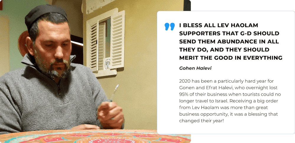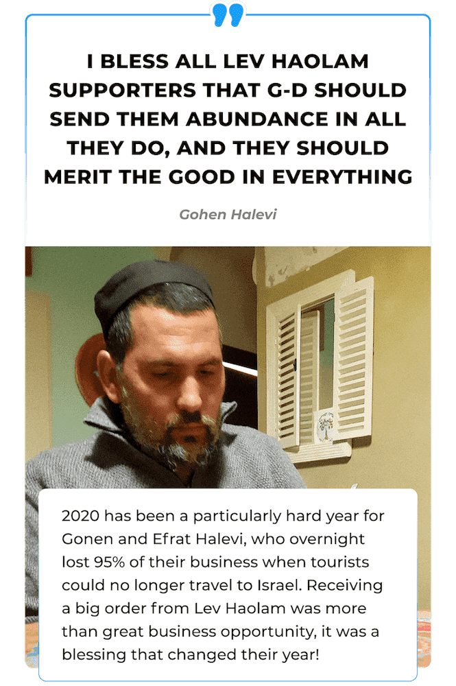 With Lev Haolam you can help to change the lives of artisans and their families without leaving home. You will be part of a life-giving force that is helping Israel to thrive.