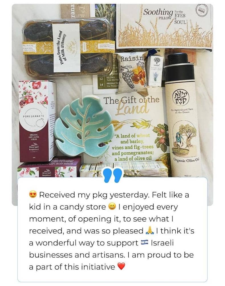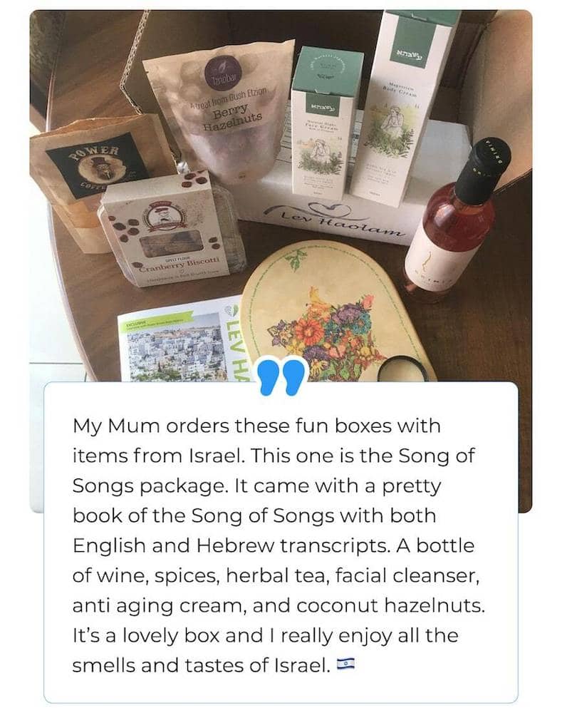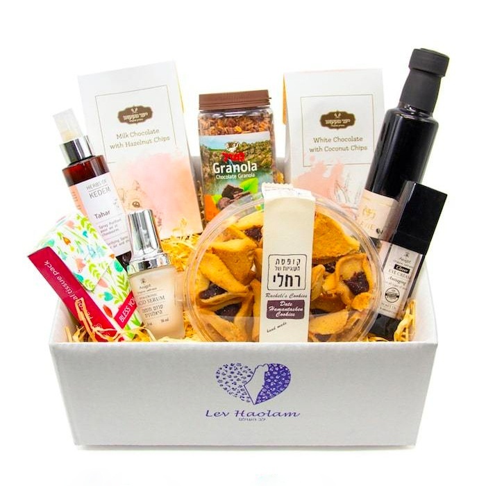 Open your box and enjoy! Every month is a surprise. You can expect honey, oils, tea, wine, organic cosmetics, Judaica, and much more. All the food products are Kosher certified.